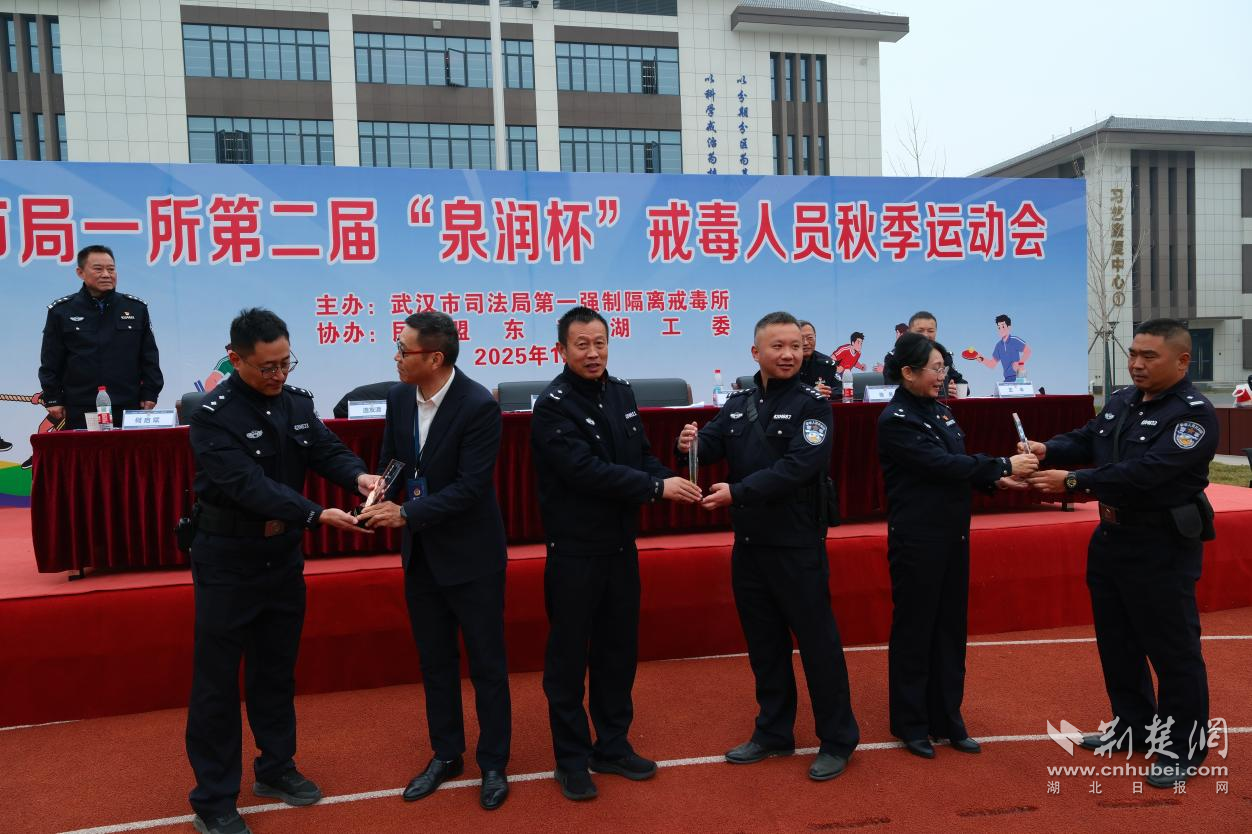 闭幕式上,所长饶玄作总结讲话充分肯定了本次运动会的组织成效与教育意义,并对民盟东西湖区工委及“黄丝带”帮教力量长期以来对戒毒工作的无私支持表示衷心感谢。他强调,此次运动会不仅是一场体能竞技的盛会,更是一堂寓教于乐、促进身心康复的集体教育课,生动诠释了“黄丝带”帮教工作融入戒治环节的积极成果。他鼓励全体戒毒人员将运动场上激发出的拼搏精神、协作意识和乐观态度,持续融入日常戒治生活,进一步坚定告别过去、走向新生的信心与决心。