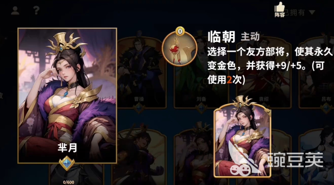 可无视合成要求,直接让某一部将立刻升到金色,且获得攻击加九和血量加五的强化效果。她的统帅技每场对局都只能使用两次,因此需要仔细地去挑选升金目标,使用时优先考虑将技能用在五级武将上,令技能带来的收益值能达到最大,同时还能降低刷牌带来的经济压力。