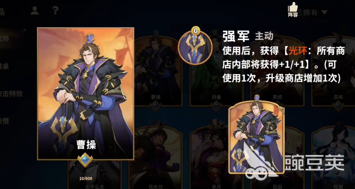 统帅曹操的光环效果与嬴政类似,初始都可为部将加一攻击和加一血量,但与嬴政不同的是曹操需用技能让商店内的部将获得加成,且初始只能用一次,每次升级商店可用次数都会加一。部将买出来后他身上的加成效果依旧会存在,但只要刷新商店,新出现的部将便不再享受加成效果。