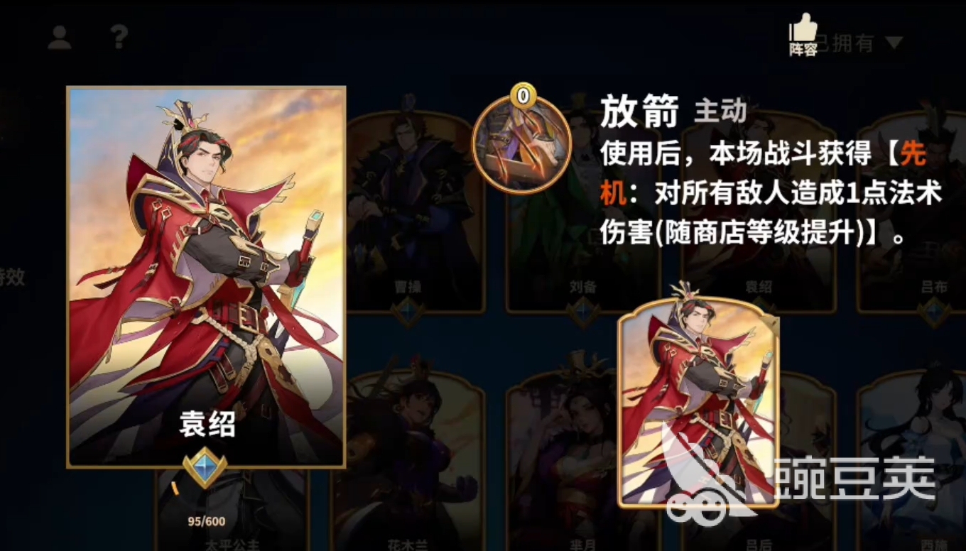 在开战时可先用统帅技对敌人都造成一次伤害,能很好地压低对手部将的血线,为己方获胜创造出更有利的条件。最重要的是,袁绍的统帅技所造成的伤害会随商店等级的提升而提升,升到高时甚至有机会能开局秒掉血量较低的部将,因此也是很适合采用速升商店流打法的统帅之一,