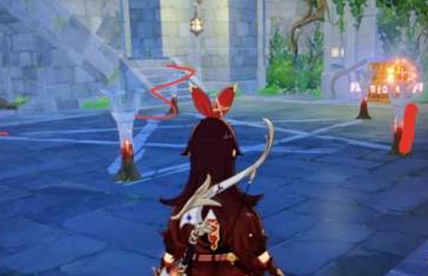 2、密任接着来到第一个塔的原神位置,然后需在蓝色柱子右边位置将火把点燃