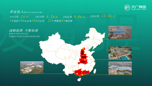 目前,集团公司已在全国5个省份拥有近30家全资分子公司,包括2个省级原种猪场等27个大型现代化养殖基地、广东大广生物科技有限公司及广东大广智能装备有限公司等,2023 年产值达6.5亿元,资产规模6.2亿元。