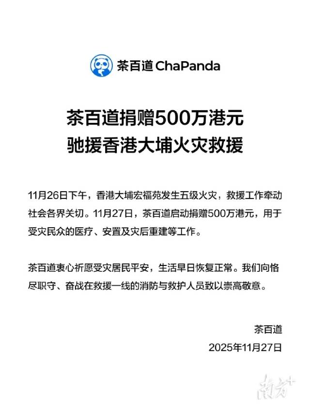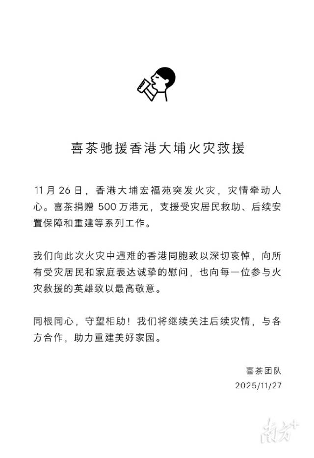 喜茶、茶百道分别捐赠 500万港元,支援受灾居民救助、后续安置保障和重建等系列工作。