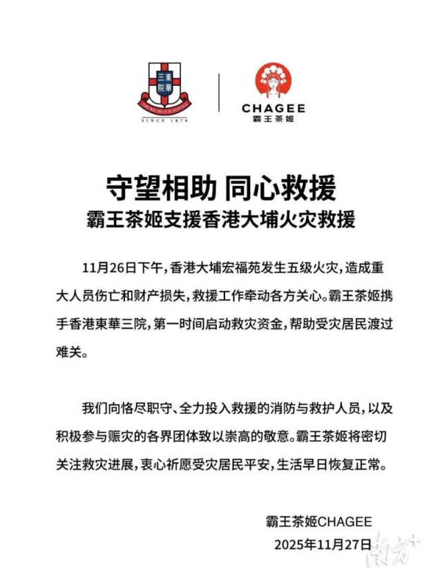 霸王茶姬携手香港东华三院,第一时间启动救灾资金,帮助受灾居民渡过难关。