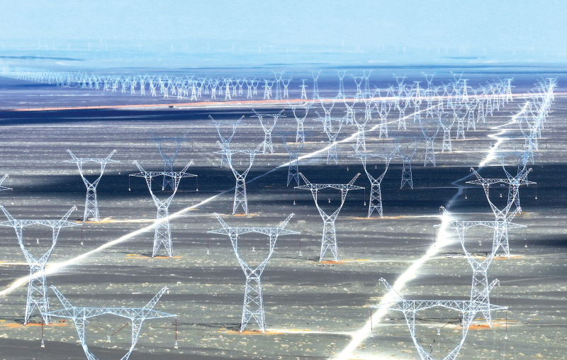 在巴里坤哈萨克自治县三塘湖镇附近拍摄的“疆电入渝”特高压工程。王菲/摄