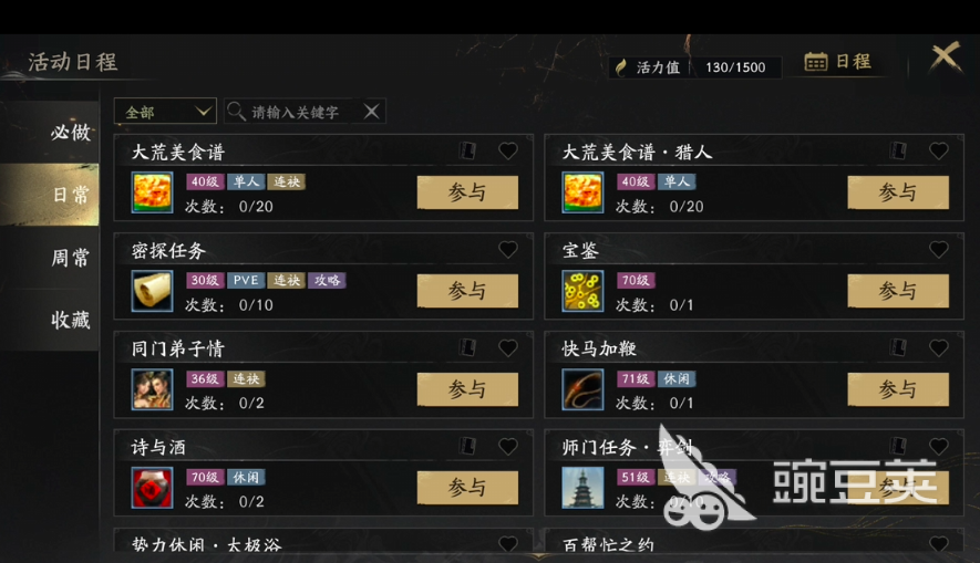 为了帮助大家更好的降肝减负,移动端还成功开启了自动任务权益,每次只需要消耗猎人老酒,就能够自动完成三仙六魔、逍遥、同门弟子情大荒美食谱等12项,真正让玩家们解放双手,任务不再发愁。小伙伴们可以先利自动任务权益刷取活跃度,而且完成日常活跃度的话,开荒时期也能够比较丝滑通过。