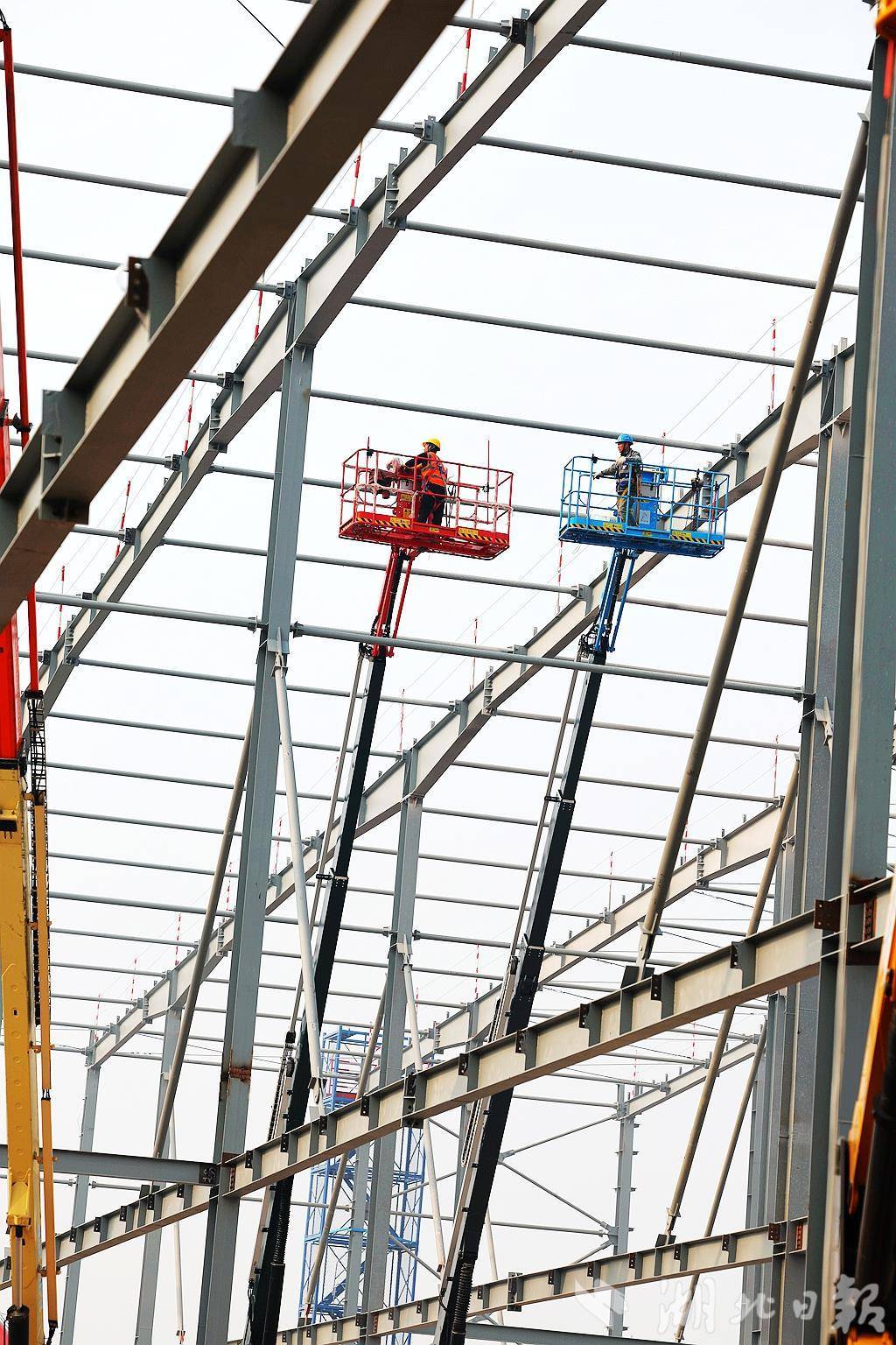 12月11日,位于宜昌猇亭区的远景动力智能锂电池生产基地项目工地,工人正在24米高空安装标准化厂房架构。