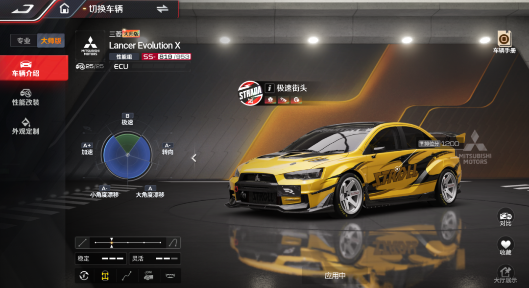 车手们注意啦!三菱 Lancer Evolution X?【专业】和【大师版】车辆共享性能改装——引擎、轮胎、电控、底盘、车身改装等级,不用再消耗零件进行改装啦!车手们可在车辆介绍页面查看和切换模式,在排位模式中,车手们可以选择想要的模式驾驶,两种模式将分别享受独立的排位分数计算哦~