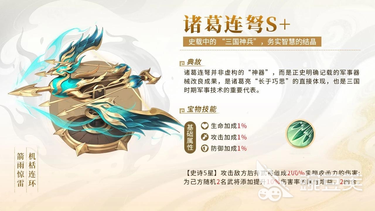 并且还会随机给周围的两个角色提高10%的战斗力,攻击能力非常的强大,而且还带来一些的辅助功能,是一款非常珍贵的宝物,借着来分享第二款宝物,这款宝物的名字叫做传国玉玺,这个宝物是有和氏璧精心雕刻而成,是统治者皇帝主权的表征,在历史上进入三国时期以后,这个传国玉玺成了人人都想要得到的宝物,更是的渲染起了权势的争斗,也是三国开战的导火索。
