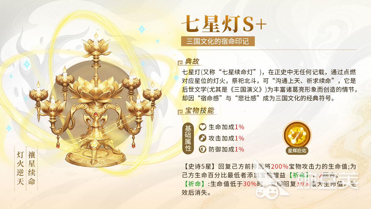 最后为大家分享的一款宝物就是S+的七星连灯,这个宝物带有很强烈的文化情感,通常都是用它祈福续命保平安的,能轻轻松松的打败北斗,能够为武将成就三维基本属性的加增,还拥有“星辉庇佑”的特殊能力,唯一一位战斗前排的武将,带来生命值的提高,命力量比较弱的队伍可以直接“祈命”,生命倘若低于30%,这个宝物能够立马回升10%的最大生命值,不但提高生命的生存力量,还能提高整个团队的恒稳性,是玩家们非常喜欢的宝物。