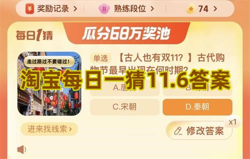 淘宝每日一猜11.6答案是今日问题的正确答案,需要大家进入答题页面中寻找,那么每日一猜11.6答案是什么呢?下面小编就给大家介绍下此问题的答案一览,感兴趣的小伙伴快来一起往下看看吧。淘宝每日一猜11.